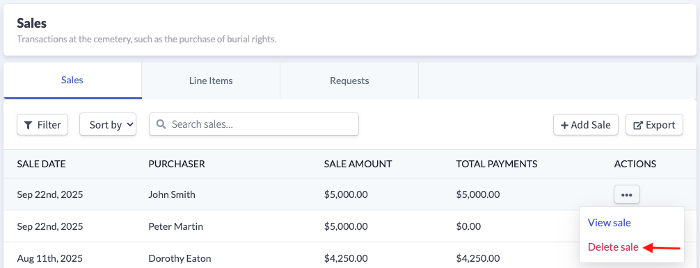 Deleting a Sale will permanently remove the sale record, including all purchaser, associated plot, line item, and payment information linked to that sale.