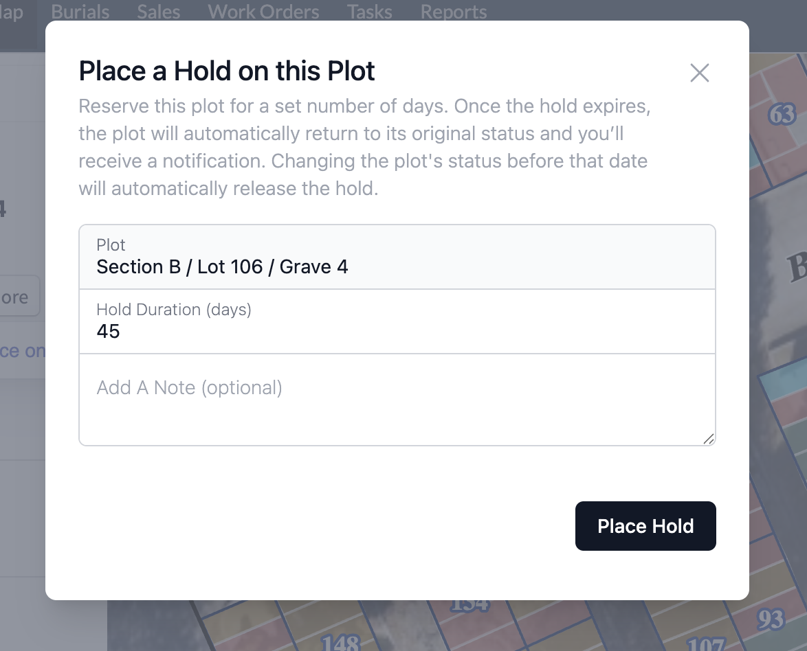 Sometimes families are still deciding whether to purchase a plot but want to ensure it isn’t sold in the meantime. Plot Holds allow staff to temporarily reserve a plot for a set number of days, automatically releasing it if no action is taken by the expiration date: