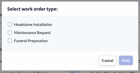 After clicking to create a new work order, you'll be prompted to select a work order type, based on your configuration: