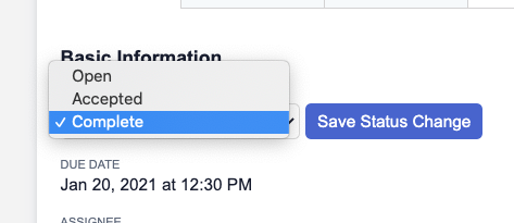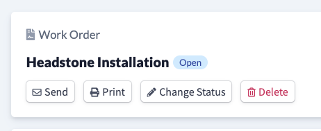 Previously, work orders had 3 statuses: Open, Accepted & Complete. Now, you can use custom statuses for each work order type. Use statuses to help understand what stage a Work Order is in. For example, for a headstone installation, you might create the following custom statuses: Open, Received, Foundation Poured, Monument Placed. Work Orders will default to the first status in your status list.