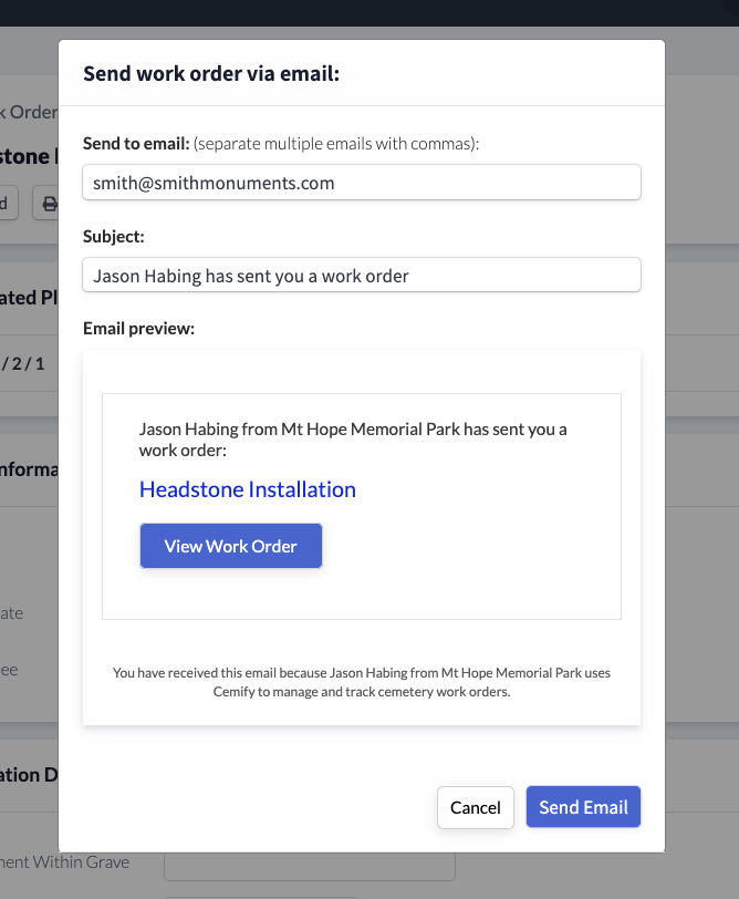 Adjust the email if necessary and click on Send Email when you're ready. This will send the newly created Work Order to the specified recipient.