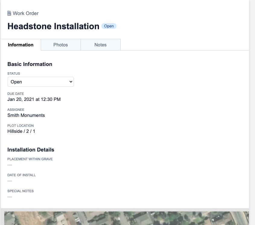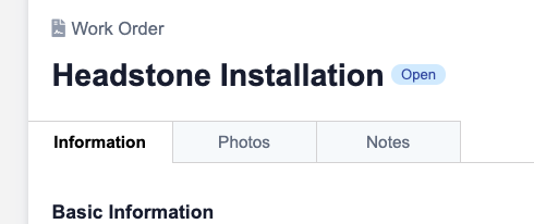 - Headstone Installation - a work order type for installing headstones at a cemetery plot.