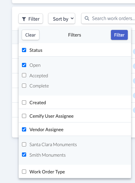 To run reports on Work Orders, click on Work Orders in the header while logged in to your Cemify account. Use the Filter button to create a filter. For example, to filter by Open work orders assigned to Smith Monuments: