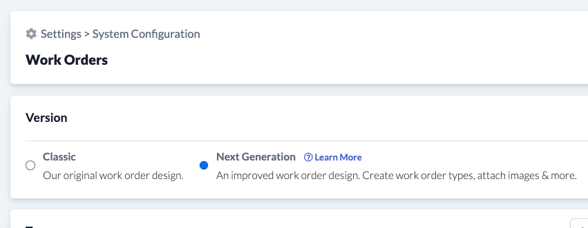 To enable next generation work orders, click on Settings in the top right corner of your screen, then click on Work Orders in the left menu. Toggle the version to Next Generation, then click Save: